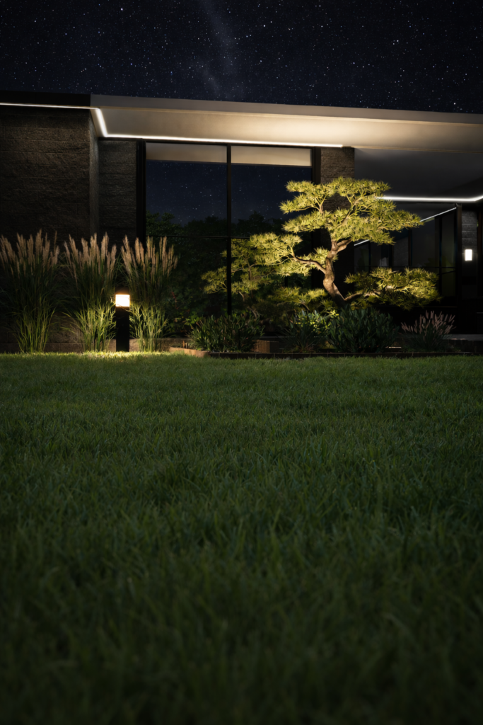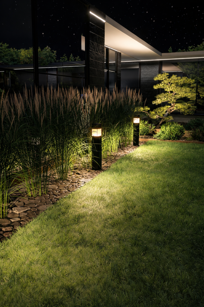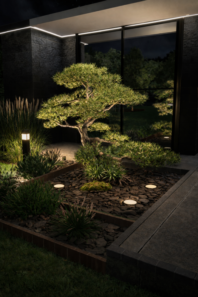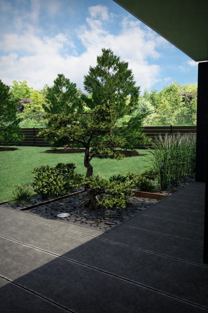 Dominuoja struktūriniai augalai, dekoratyvinės žolės ir kruopščiai suformuotos kompozicijos su aiškiai apibrėžtais kraštais. Tamsūs elementai ir kontrastingos medžiagos sustiprina modernų charakterį, o apšvietimas sukuria estetiką ir jaukumą vakarais.
