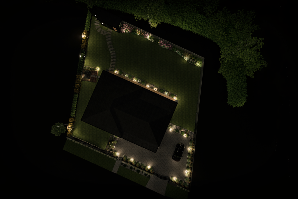 Vakarinis apšvietimas sustiprina architektūrą ir suteikia kiemui jaukumo bei reprezentatyvumo tamsiuoju paros metu.