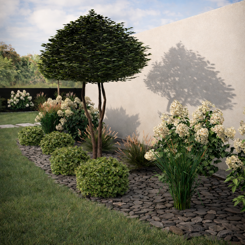 Projektuojant buvo išlaikytos švarios linijos, suformuotos aiškios želdynų ribos bei pasirinkti struktūriniai, ilgalaikiai augalai. Akmens skaldos danga ir formuoti medžiai suteikia erdvei ritmą, vizualinę tvarką ir modernų charakterį.